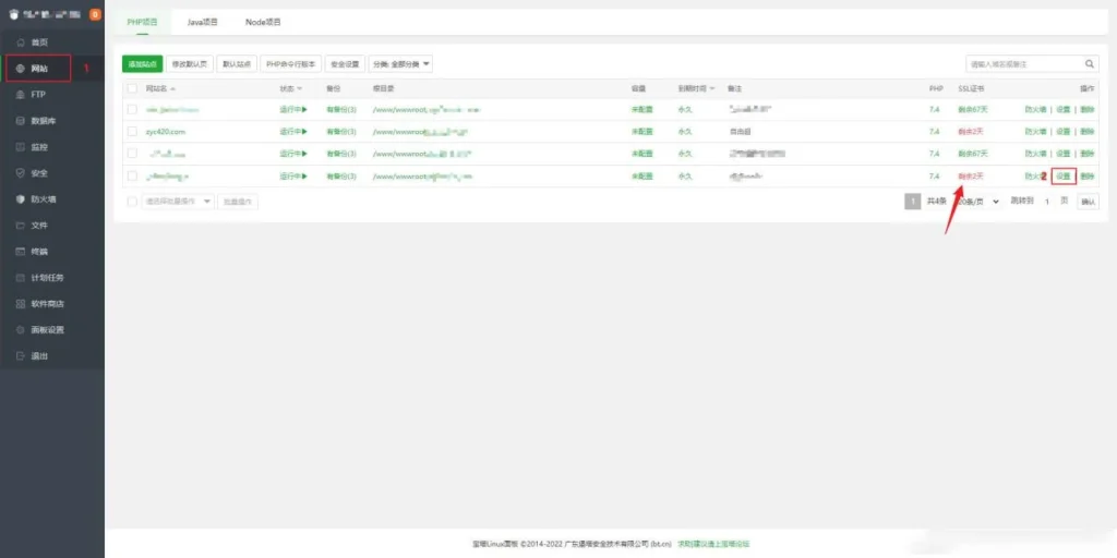 进入网站设置:登录宝塔面板后台,点击左侧菜单栏中的“网站”,找到需要续签SSL证书的网站,点击其右侧的“设置”按钮。