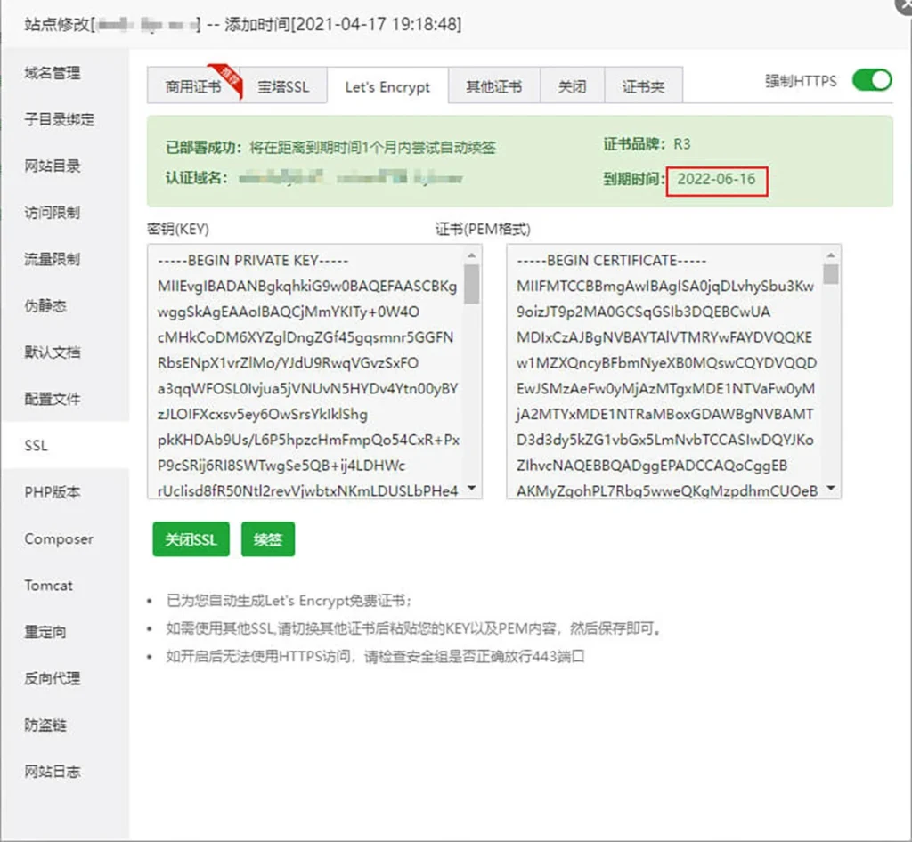 进行续签操作:在“Let’sEncrypt”证书区域,点击“续签”按钮,系统会自动开始续签证书。
