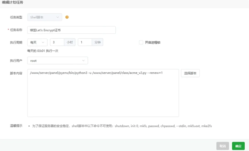 配置任务参数:在“任务类型”中选择“Shell脚本”;“任务名称”可任意填写,如“续签Let’sEncrypt证书”;“执行周期”建议设置为每天,如“3小时1分钟”;“执行用户”选择“root”。在“脚本内容”中输入以下脚本: