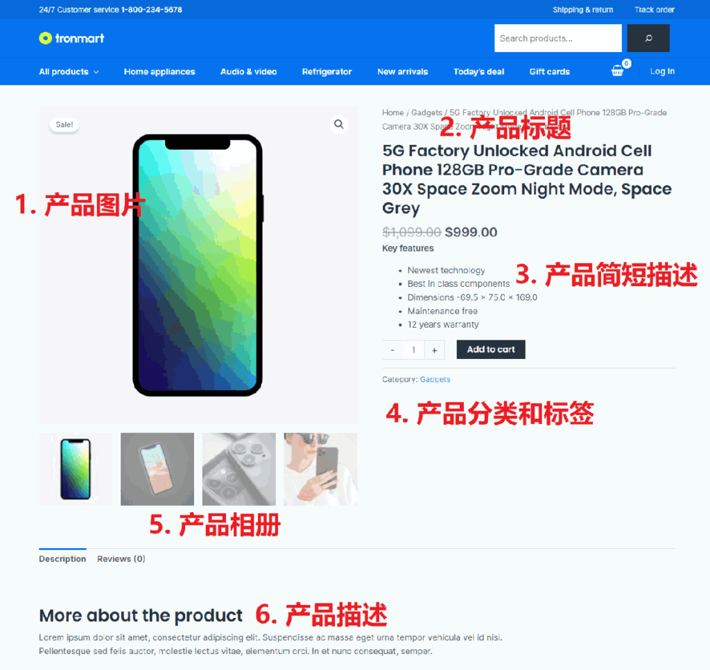 单个产品页面:展示产品图片、详细描述、价格、库存等信息,引导客户下单。