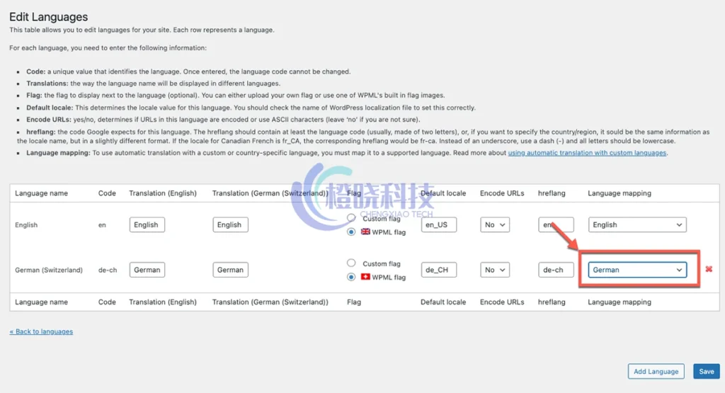 转到WPML → 语言,然后点击编辑语言。在这里,您可以看到一个带有下拉菜单的列,您可以在其中为网站的每种语言选择语言映射。