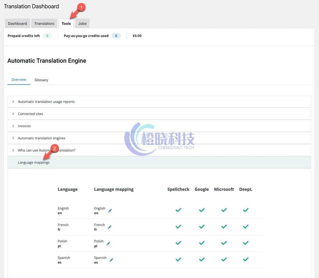 转到 WPML → 翻译仪表盘,然后点击工具选项卡。 单击语言映射。