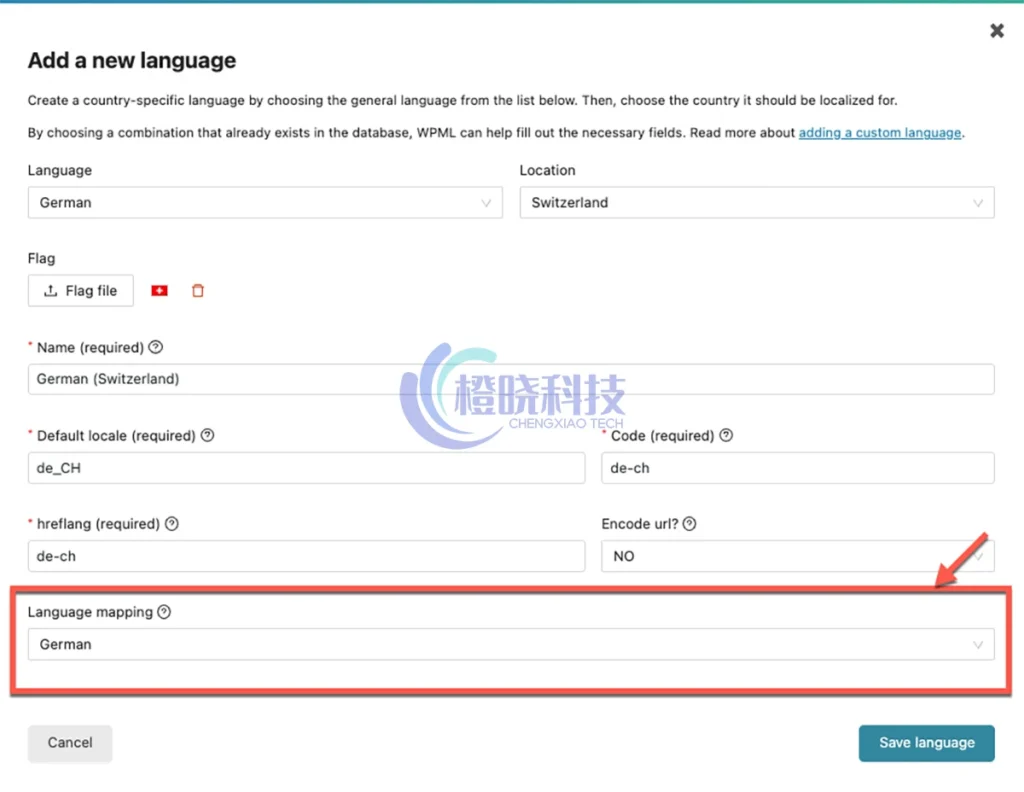 首次设置网站的语言时,您可以在创建自定义语言时决定映射。