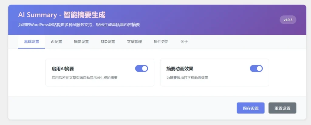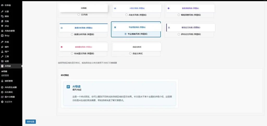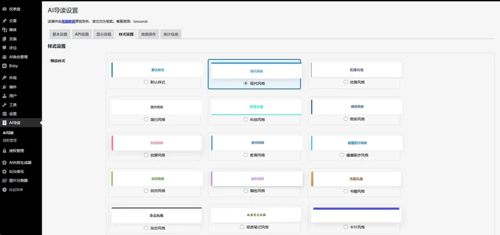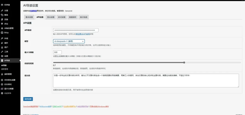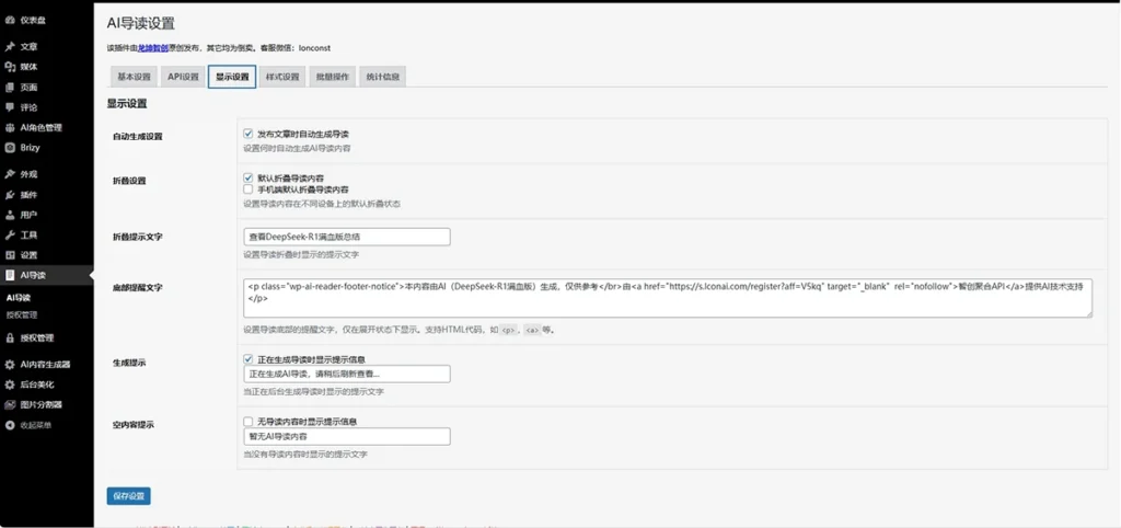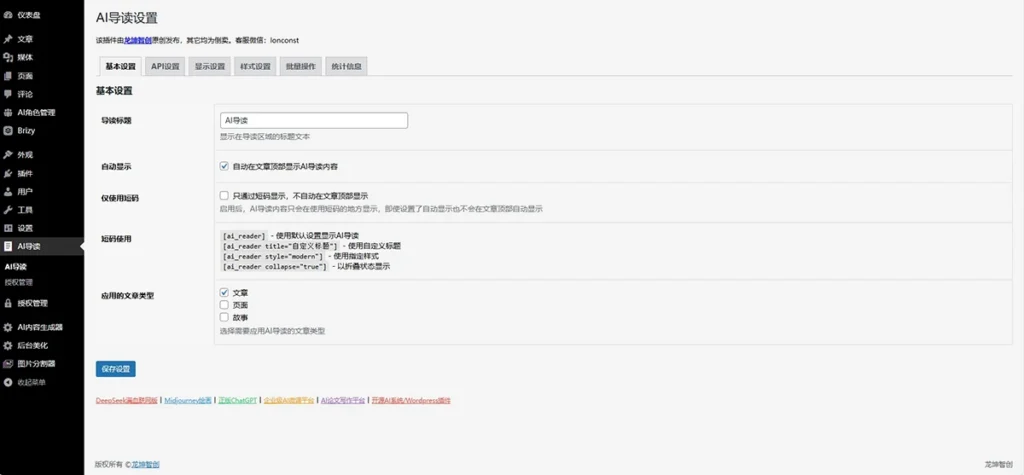 AI 导读插件:利用 AI 技术自动为文章生成智能导读摘要,提供 19 + 种精美预设样式,支持自动显示和短码嵌入两种方式,可批量生成和更新文章摘要,还能自定义提示词、设置折叠状态等,适配各种设备。