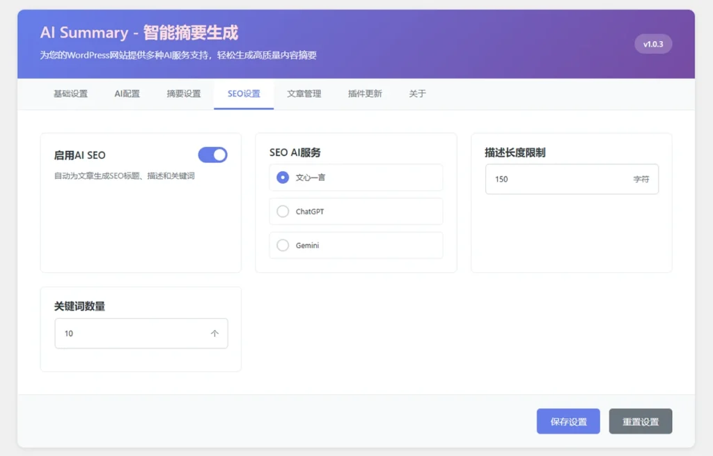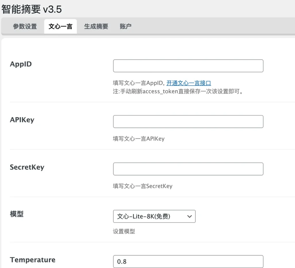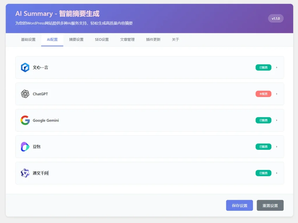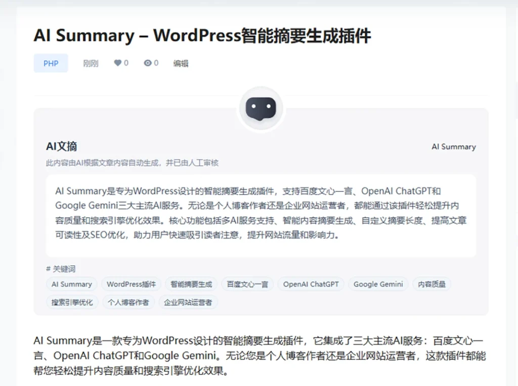 AI Summary:集成了百度文心一言、ChatGPT、Gemini、豆包和通义千问五大主流 AI 服务,可自动提取文章核心内容生成摘要,进行 SEO 自动优化,还具备批量管理、数据缓存等功能,前端展示有打字机动画效果等。