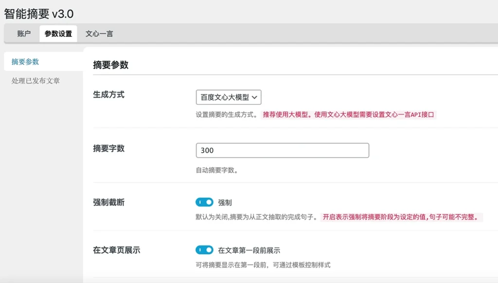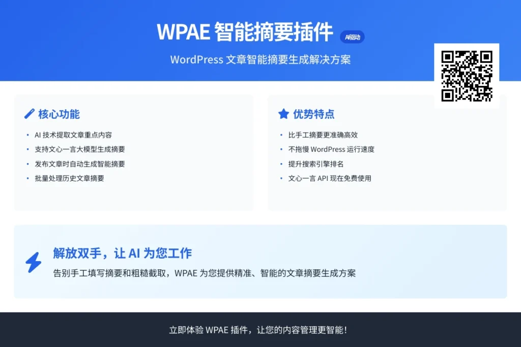 WordPress 智能自动摘要插件 WPAE:利用 AI 技术提取文章重点内容作为摘要,集成了免费的文心一言,可在文章发布时自动生成智能摘要,也能在后台一键为历史文章生成摘要,并可将摘要展示在文章第一段前面。