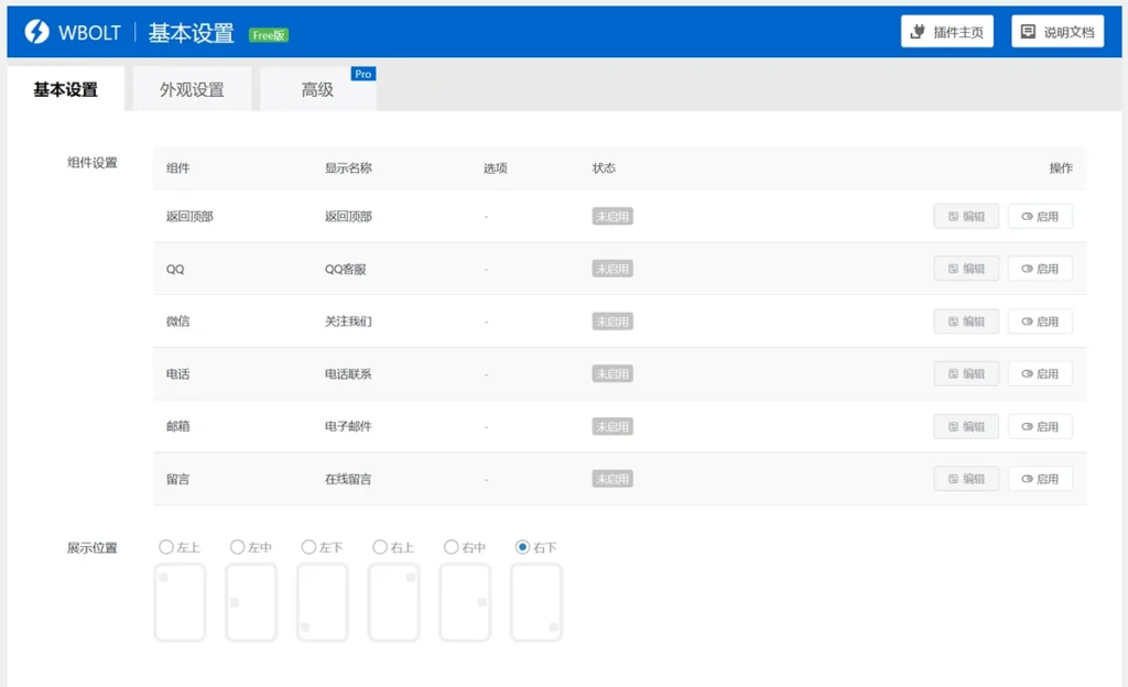 站长可以根据自身网站情况设置组件显示位置,包括左上,左中和左下;右上,右中和右下。一般建议设置为右下比较合适。