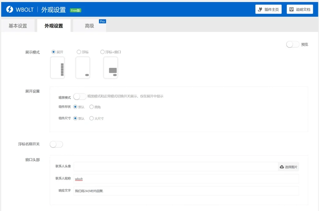 插件支持不同的外观设置,比如默认展开客服联系组件,浮标形式或者浮标加窗口形式(注:移动端仅使用浮标形式)。并且可以设置联系人头像、联系人昵称及客服响应文字;欢迎语等。