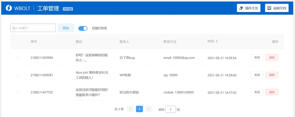 插件提供访客留言管理工单,以便于站长或者网站运营人员根据线索,及时跟进客户访客留言。