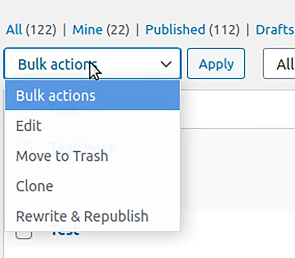 - 在“编辑帖子”/“编辑页面”中,您可以选择一个或多个项目,然后在“批量操作”下拉菜单中选择“克隆”,即可一次性复制所有项目。