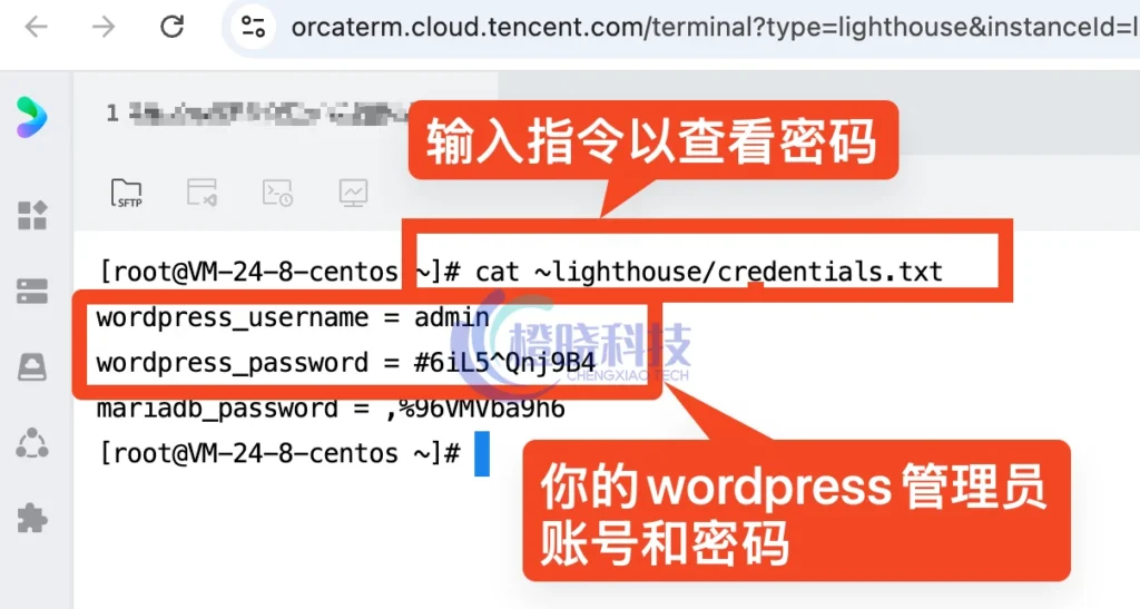 需要WordPress管理员账号和密码来进入后台,默认的管理员账号是admin,但管理员密码并不会明文显示。以腾讯云为例,在云服务商平台中找到应用管理详情页,点击登陆,使用相关命令查看密码。