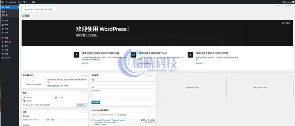 登录后即可看到WordPress后台界面,在这里可以进行写文章、自定义网站布局、管理插件等操作。